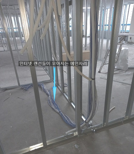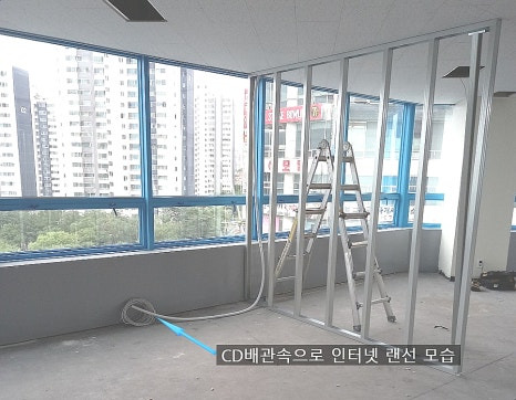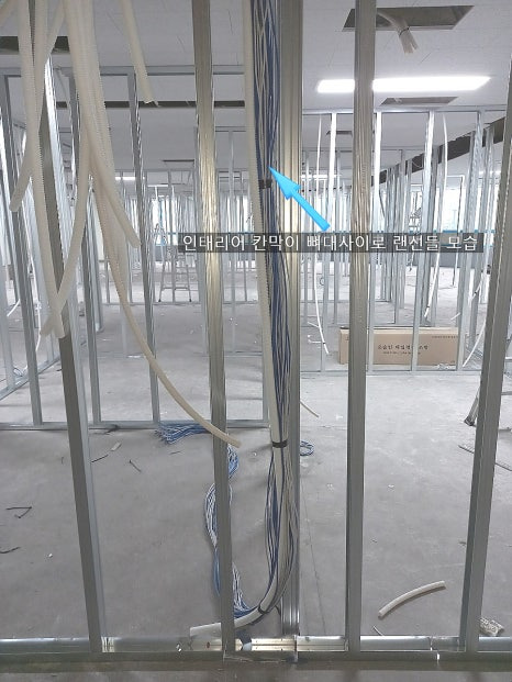 사무실 내 칸막이 공사의 뼈대 시공 시 랜선을 재단중인 장면들입니다.↑인태리어 공사할때 랜선을 재단하면 노출없이 깨끗하게 마무리 됩니다.