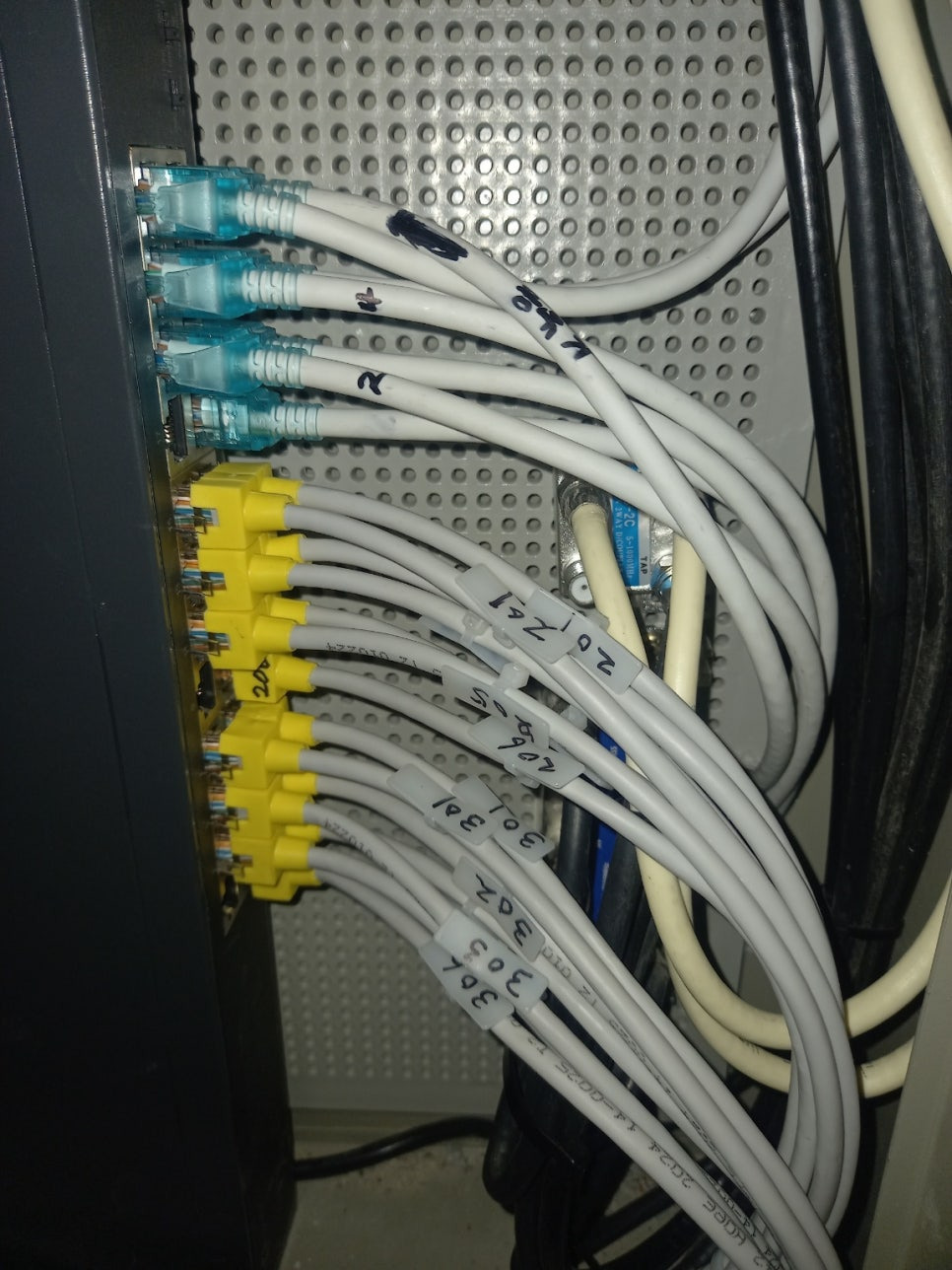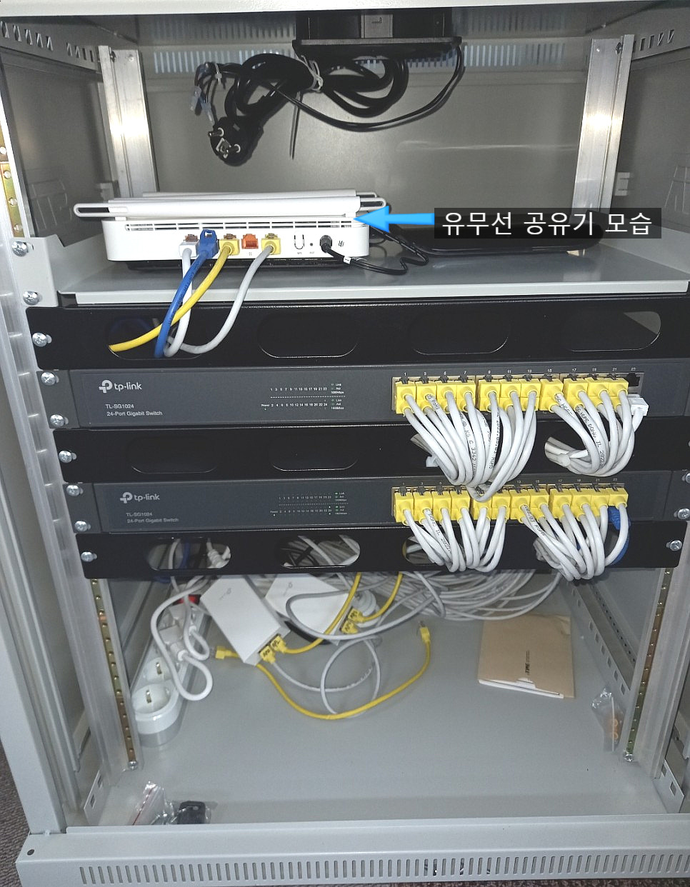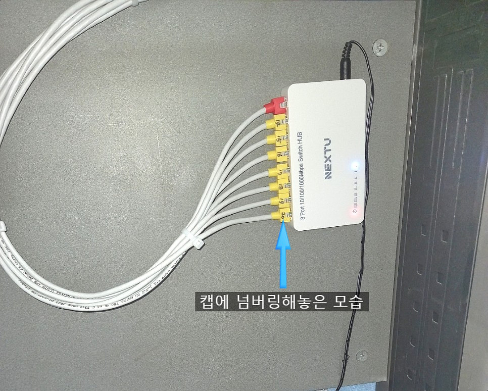 메인 허브 렉속 랜선들 정리가 되어가는 모습